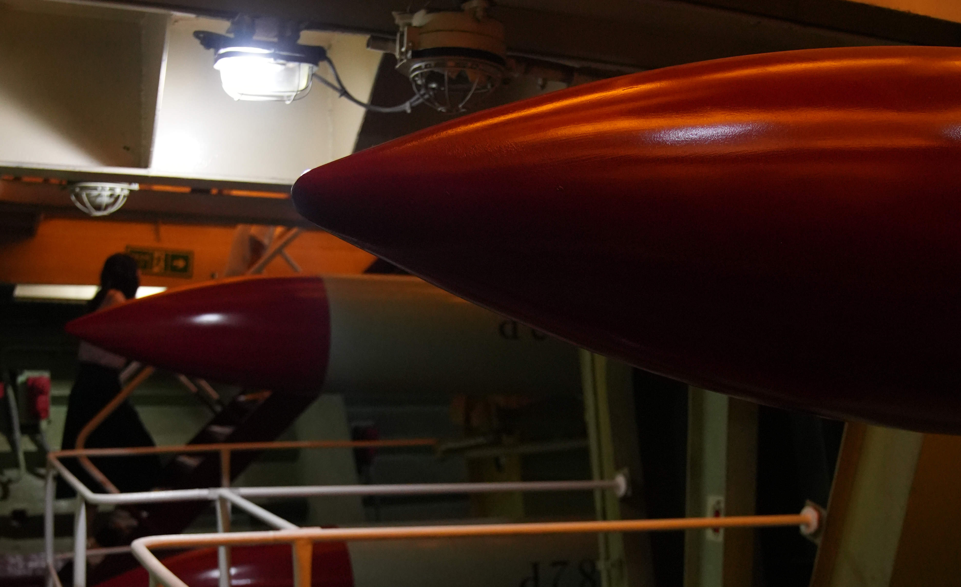 基輔航母的反潛導彈庫,位于三甲艦首部分。這里曾裝載著具備自導功能的反潛導彈,主要用于遠距離反潛,裝填自動化。庫內還存有全艦唯一實彈供游客近距離參觀,感受航母反潛作戰的強大實力。