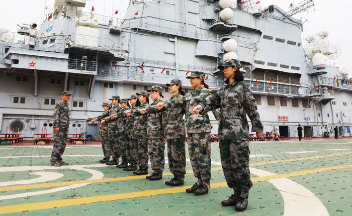 入隊授旗儀式后,全體民兵在“基輔號”航母甲板上開展了入隊訓練,在二甲國防教育展廳開展國防教育,并進行政治學習。
