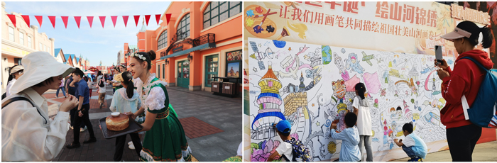 黃金周8天,園區(qū)內(nèi)各類演出124場(chǎng)輪番上演,為游客帶來豐盛的“文化大餐”。限時(shí)回歸的摩托車極限挑戰(zhàn)類演出《極炫飛躍》,與王牌演出《航母風(fēng)暴》《飛車特技》一同為游客帶來驚險(xiǎn)刺激的感官體驗(yàn),演出場(chǎng)場(chǎng)爆滿、歡呼聲陣陣。俄羅斯風(fēng)情街上,面包蘸鹽·俄式最高歡迎禮、中秋“洋嫦娥”情景演繹以及俄羅斯風(fēng)情歌舞街頭秀,為游客帶來沉浸式異域風(fēng)情體驗(yàn)。國(guó)慶主題互動(dòng)打卡區(qū)內(nèi)手繪墻、點(diǎn)贊墻、打卡拍照墻、創(chuàng)意地面滾球抽獎(jiǎng)活動(dòng)吸引眾多親子游家庭參與。