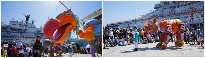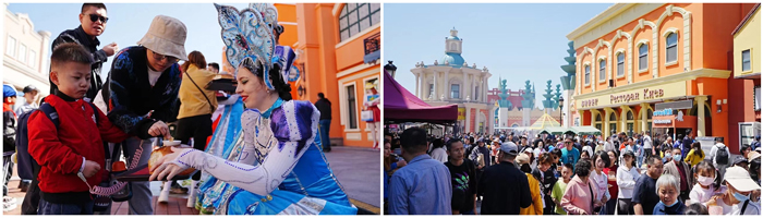 節(jié)日期間,“基輔號(hào)”航母、潛艇、驅(qū)逐艦上人頭攢動(dòng);全面升級(jí)的飛車特技表演場(chǎng)內(nèi)座無虛席、場(chǎng)場(chǎng)爆滿、歡呼陣陣;充滿童趣的巨型木偶劇表演,吸引眾多親子游家庭前往互動(dòng)參與;俄羅斯風(fēng)情街舉行的“面包蘸鹽”俄式最高歡迎禮活動(dòng),讓游客深度體驗(yàn)異域風(fēng)情;新增的護(hù)衛(wèi)艇巡航、漂移車等體驗(yàn)項(xiàng)目吸引大批游客參與;水陸兩棲車、噴氣飛艇、摩托艇等水上項(xiàng)目排隊(duì)人流不斷;航母美食街、小吃大排擋等新增餐飲點(diǎn)美食云集、生意火爆,景區(qū)內(nèi)熱鬧非凡、一派繁華盛景。